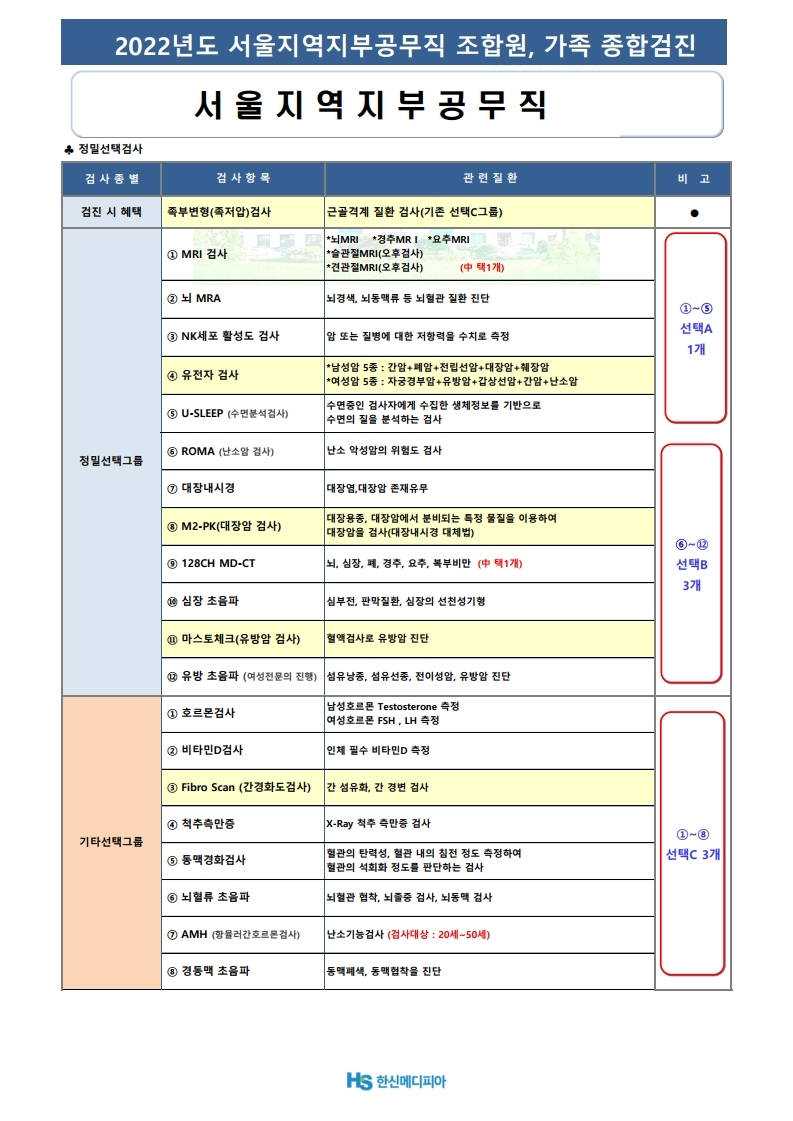 2022년 하나로의료재단 건강검진항목표 및 약도