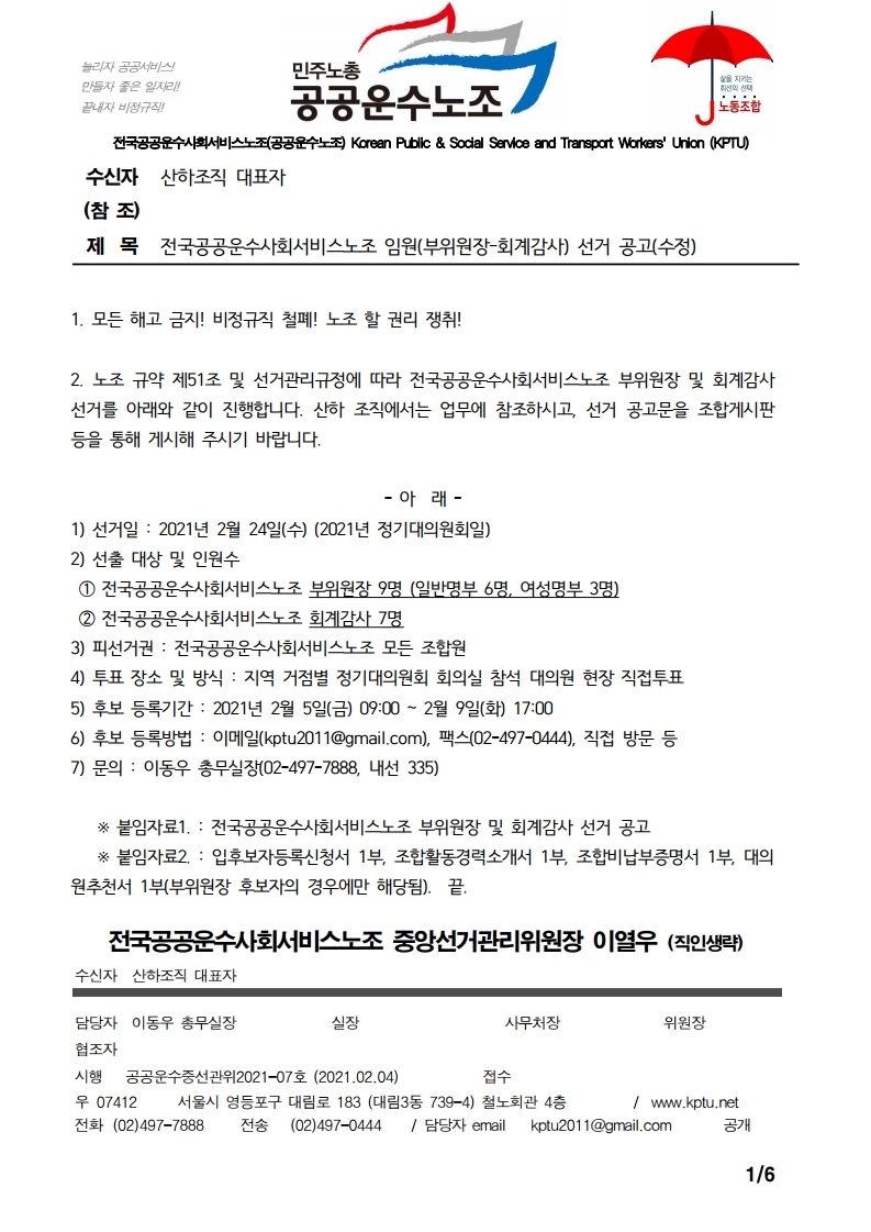 전국공공운수노조 임원(부위원장,회계감사) 선거공고