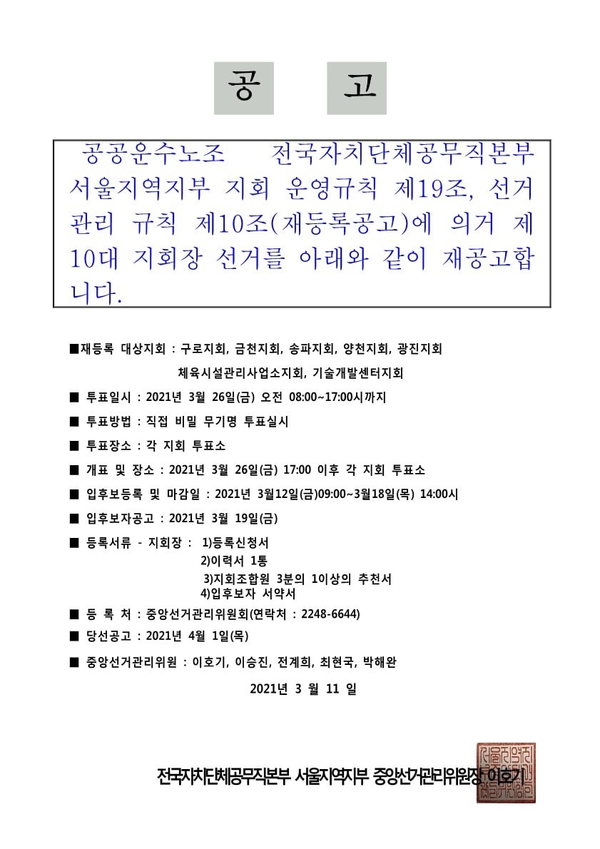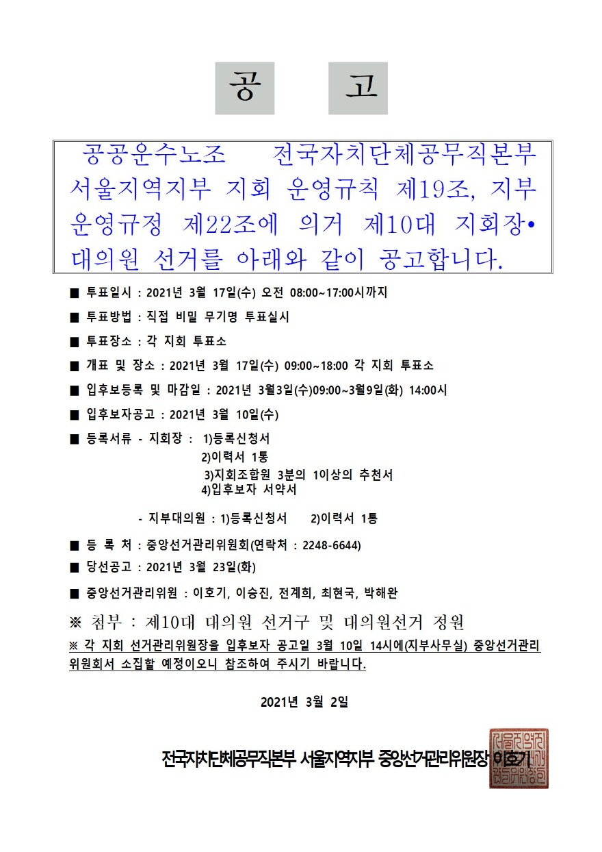 서울지역지부 제10 대 지회장 및 대의원 선거 공고