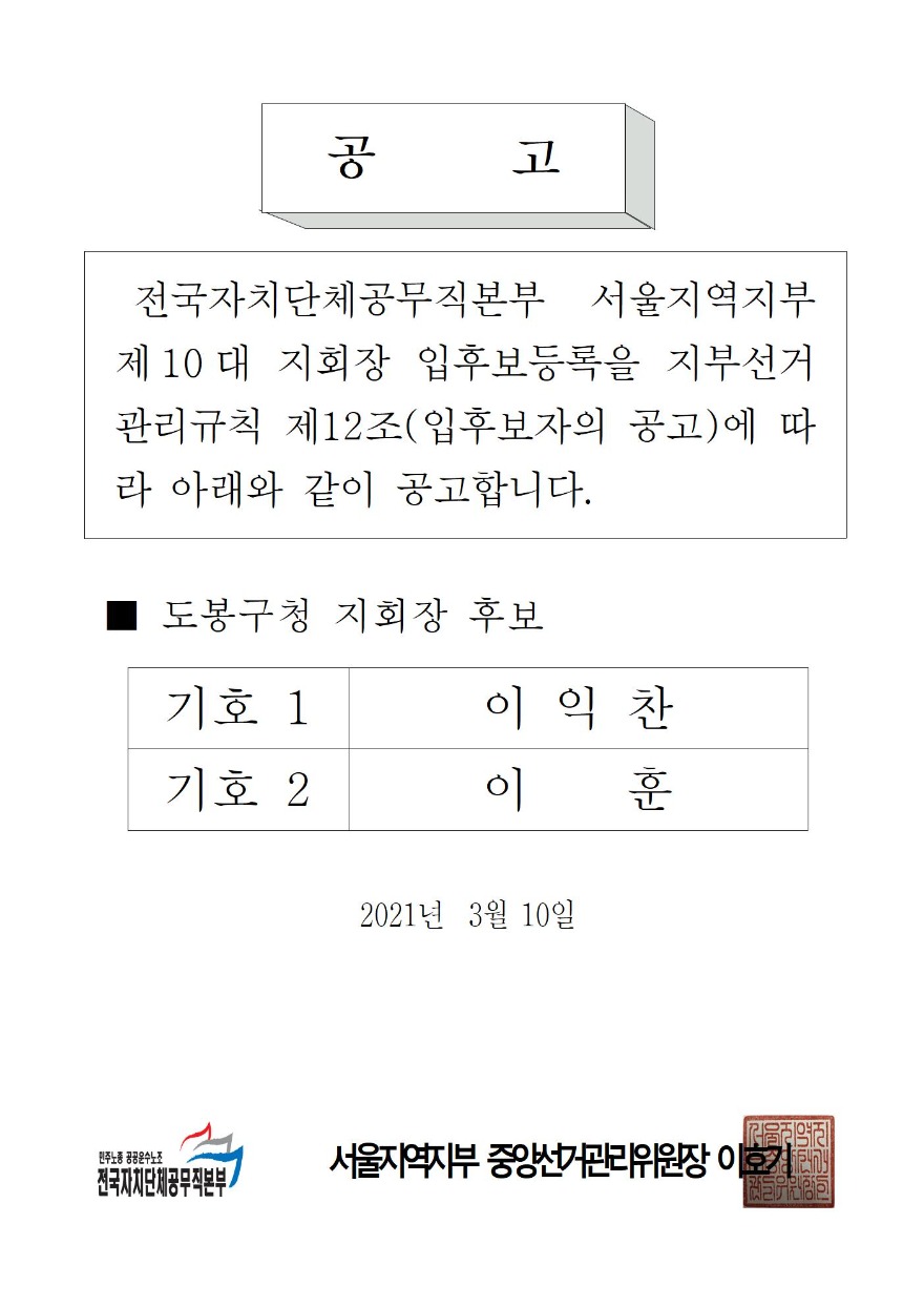 서울지역지부 제10대 지회장 입후보등록을 지부선거관리규칙 제12조(입후보...