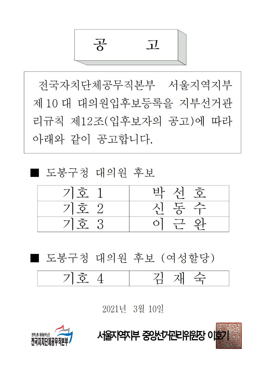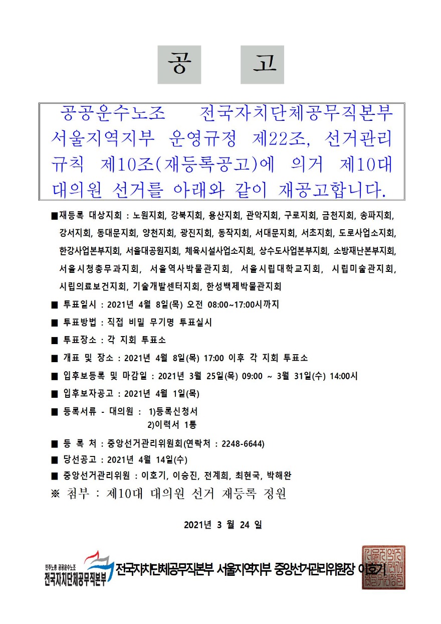 서울지역지부 제10대 대의원 선거 입후보자 공고