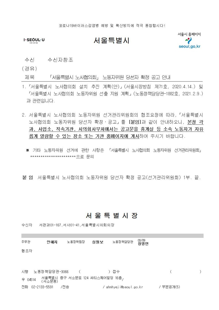 서울특별시 노사협의회 노동자위원 당선자 확정공고