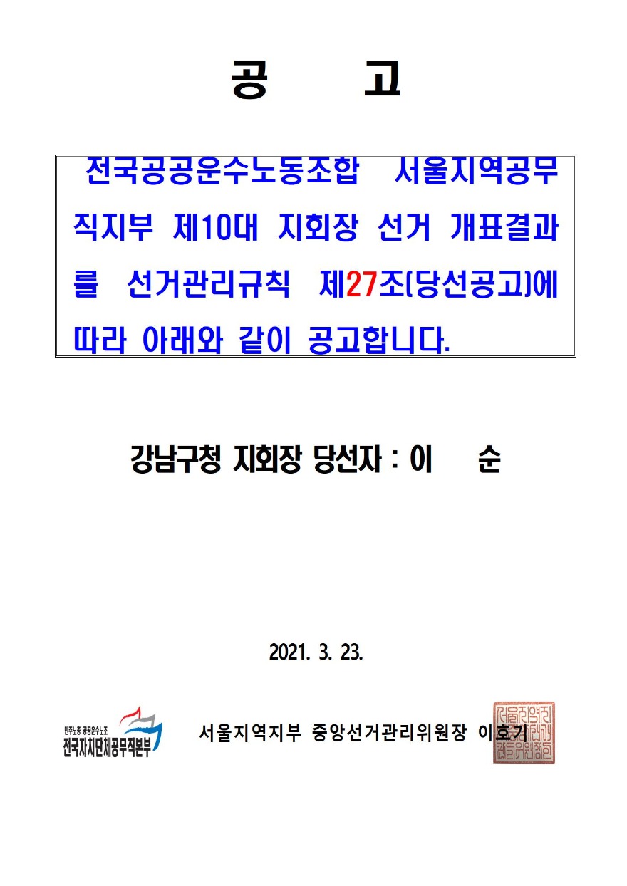 서울지역지부 제10대 지회장/대의원 당선자공고