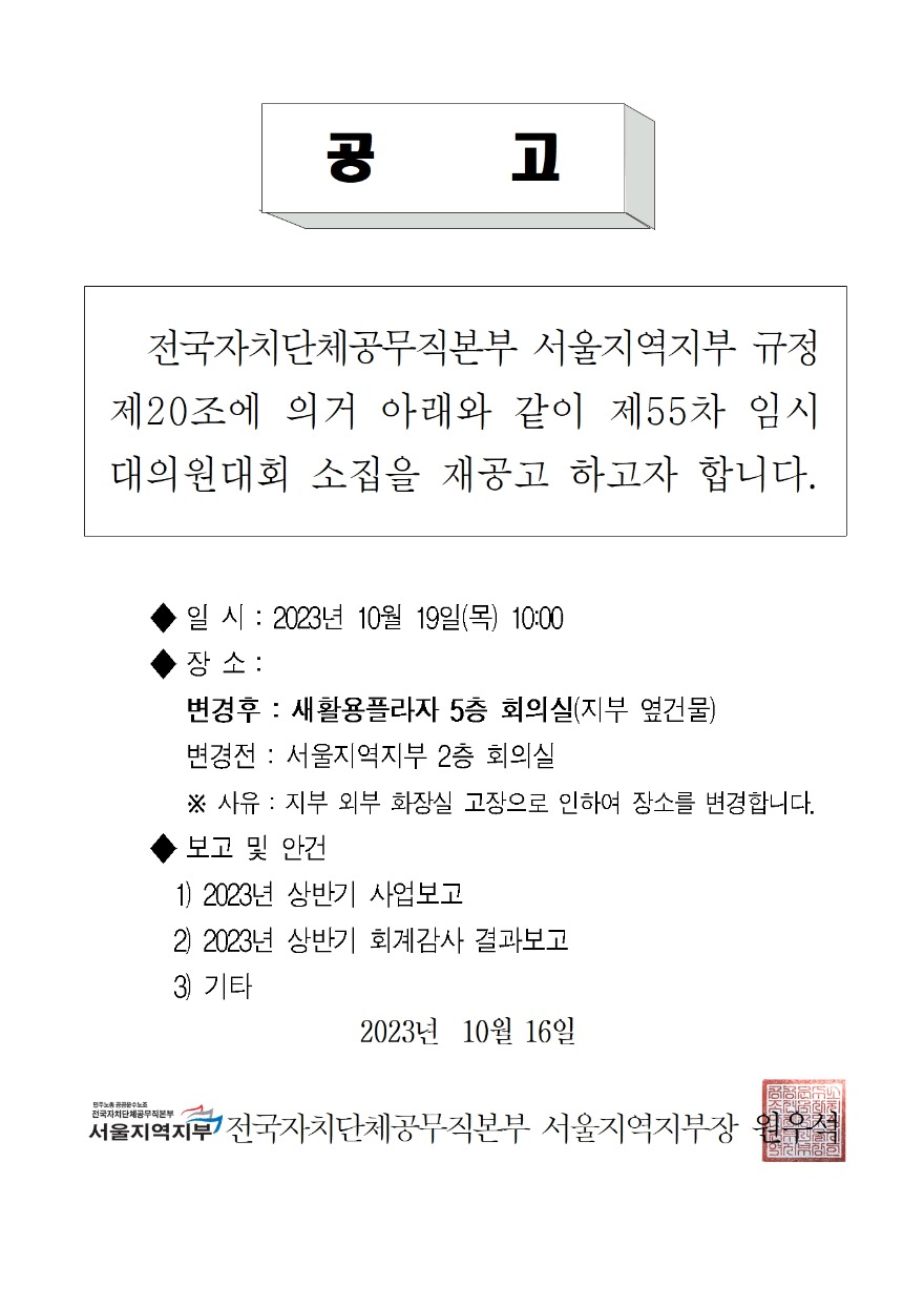 서울지역지부 제55차 임시대의원대회 재공고문 공지